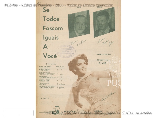 Partitura de Se todos fossem iguais a você, com Angela Maria, Tom e Vinícius na capa e lista dos principais intérpretes. > Se todos fossem iguais a você Maysa grava Se todos fossem iguais a você, de Vinícius de Moraes e Tom Jobim.