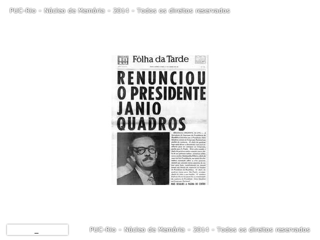 O jornal A Folha de São Paulo anuncia a renúncia de Jânio. > Renúncia de Jânio Quadros Jânio Quadros renuncia à presidência da república (25/08). Assume o Vice-Presidente João Goulart.