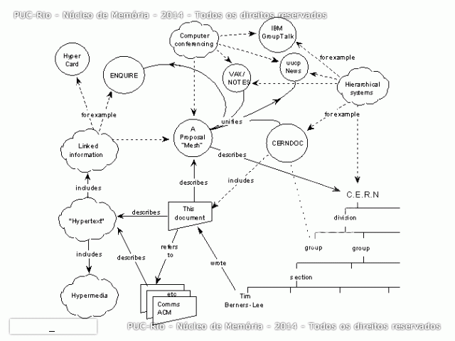 Ilustração utilizada no paper original de Tim Berners-Lee propondo a estrutura da World Wide Web > Início da World Wide Web. O pesquisador britânico Tim Berners-Lee desenvolve o conceito e as ferramentas básicas da World Wide Web.