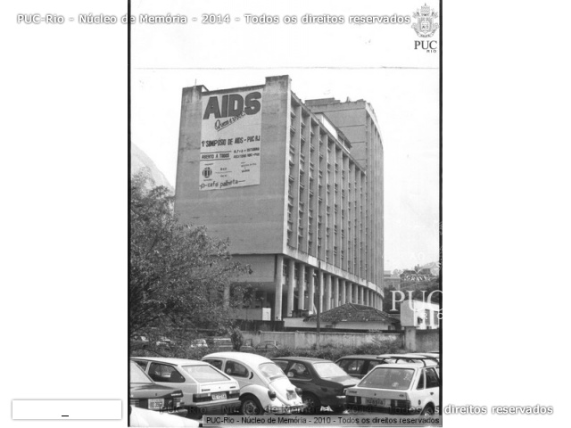 Faixa do 1º Simpósio Nacional sobre a Aids, na lateral do Edifício Cardel Leme. > Primeiro Simpósio sobre a AIDs. A PUC-Rio realizou o 1º Simpósio sobre a AIDS.