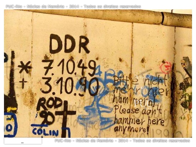 Fragmento do Muro de Berlim com inscrição alusiva ao final da Alemanha Comunista em 1990. > Reunificação da Alemanha. Após a queda do Muro de Berlim em 1989, as duas Alemanhas se unificam.