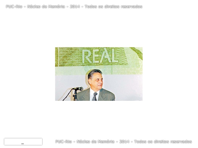 Fernando Henrique Cardoso durante o lançamento do Plano Real. > Lançamento do Plano Real. Lançamento do Plano Real, plano de estabilização econômica desenvolvido por economistas ligados à PUC-Rio.