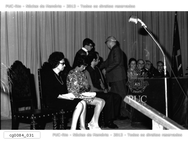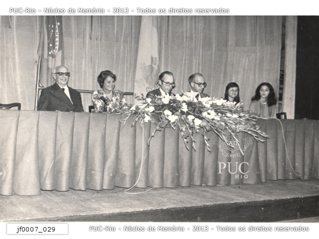 Mesa com autoridades em evento não identificado (talvez formatura). |
