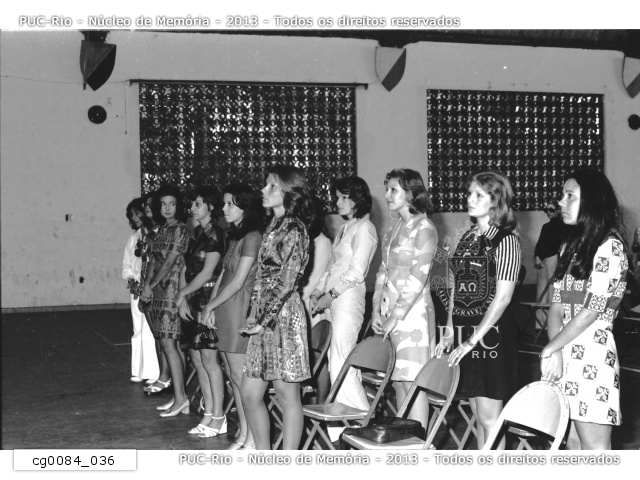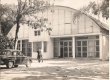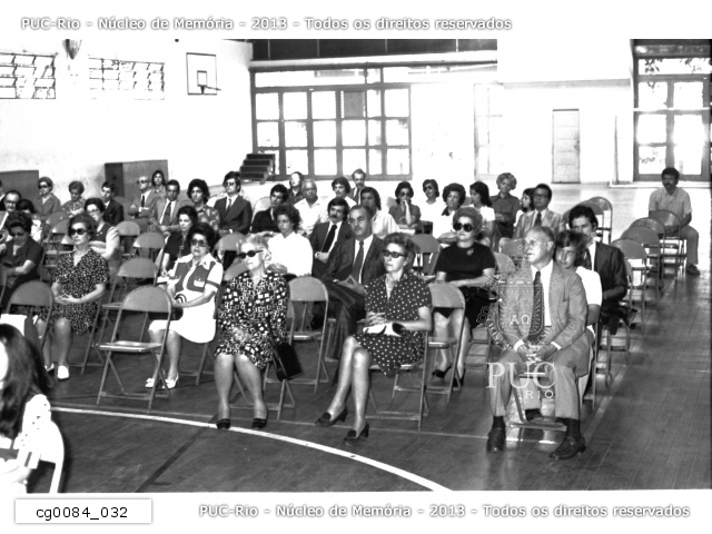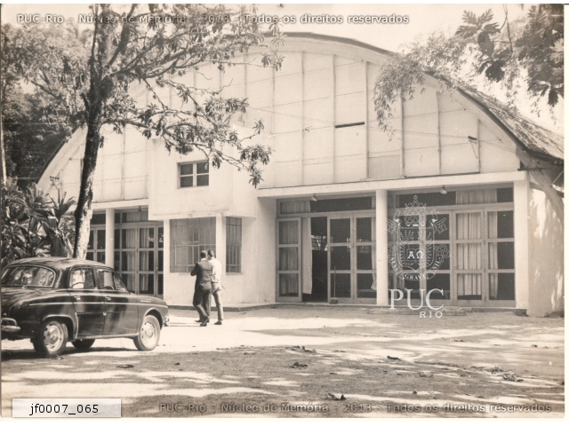 Frente do Gináso de Esportes da PUC. Ao centro, cabine de projeção equipada com projetor de 35mm. Havia um palco para shows e um piano para apresentações musicais. Em frente, estacionado, um Gordini. |