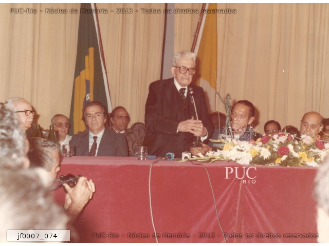 Sobral Pinto recebe da Universidade a Medalha de Mérito Cardeal Leme. Na ocasião ele fez a conferência "O papel do advogado na democratização do país". A entrega da medalha foi feita por Tancredo Neves. |