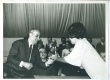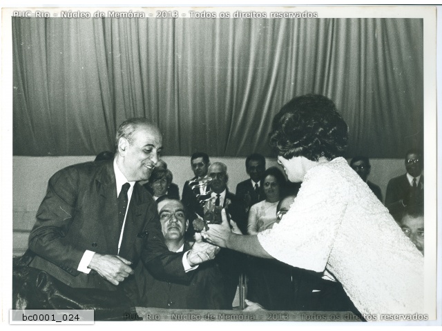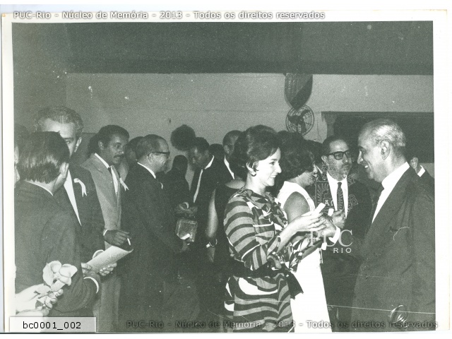 Formanda recebe o diploma do Reitor Padre Laércio Dias de Moura S.J. durante a formatura da primeira turma do curso de Jornalismo da PUC-Rio que se formou em separado à Faculdade de Filosofia, após a Reforma Universitária que criou os departamentos, no caso, o Departamento de Comunicação Social. |