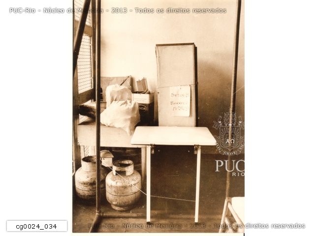 Após um incêndio na favela da Praia do Pinto, móveis dos favelados são guardados no ginásio desportivo da PUC-Rio. Os móveis e utensílios são agrupados e identificados por barraco. |