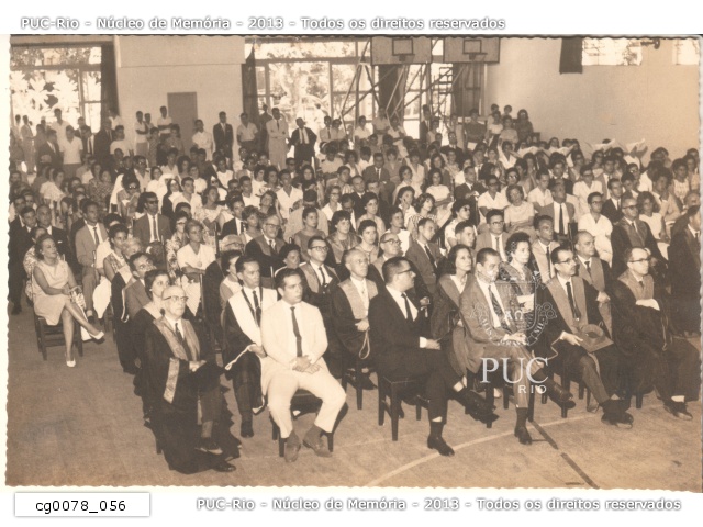 Discurso do Reitor Padre Laércio Dias de Moura S.J. durante a formatura da primeira turma do curso de Jornalismo da PUC-Rio que se formou em separado à Faculdade de Filosofia, após a Reforma Universitária que criou os departamentos, no caso, o Departamento de Comunicação Social. |