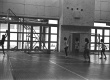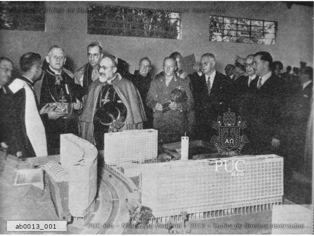 Inauguração da nova sede da PUC-Rio na Gávea durante o 36º Congresso Eucarístico Internacional. O reitor pe. Pedro Belisário Velloso Rebello S.J. e as autoridades presentes apreciam a maquete do novo campus em exibição no ginásio esportivo. |
