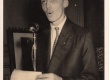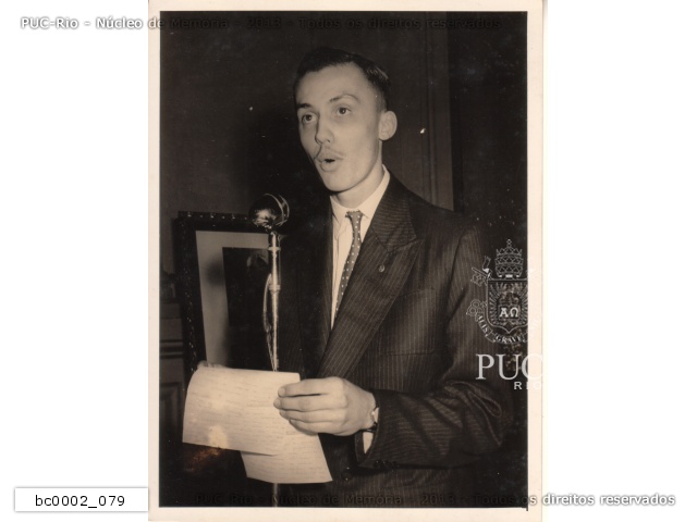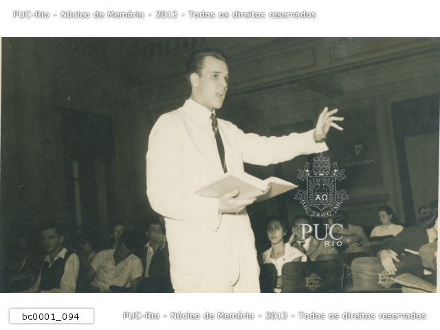 Aluno discursa no Dia do Reitor. Ao fundo, quadro com imagem do Papa Pio XII. |