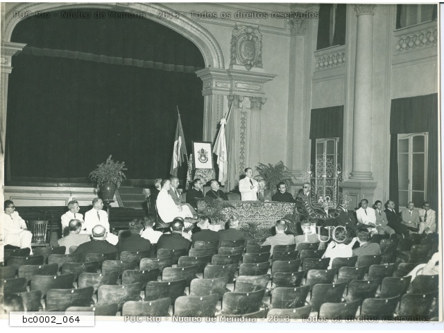 Relato com foto da instalação solene dos cursos das Faculdades de Filosofia e de Direito das Faculdades Católicas no auditório do Colégio Santo Inácio com a presença de autoridades, políticos e eclesiásticos. (cópia em xerox) |