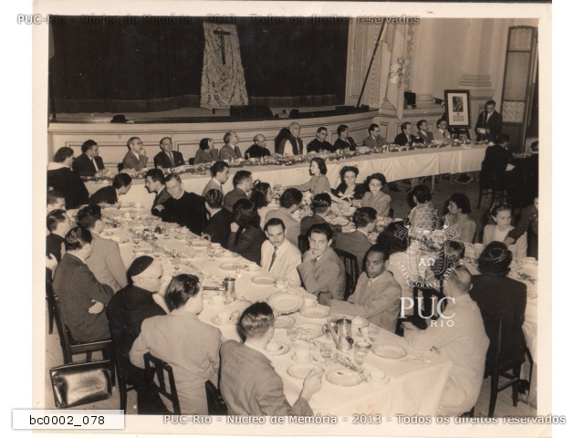Padre Leonel Franca S.J. e convidados, no almoço em comemoração ao Dia do Reitor, no auditório da antiga sede das Faculdades Católicas na rua São Clemente. |