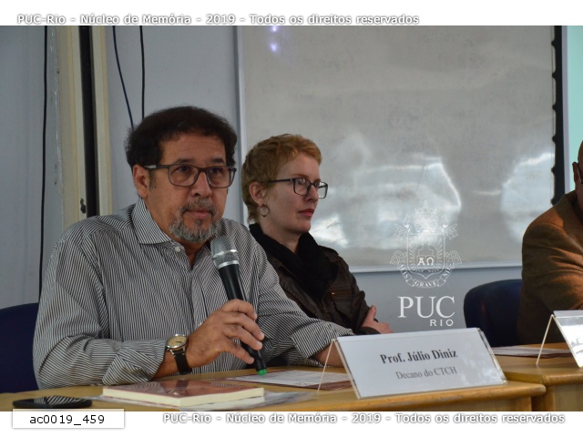 O professor e decano do CTCH, Júlio Cesar Valladão, Diniz no debate e lançamento do livro "A Doença e o Tempo", escrito pelo professor Eduardo Jardim, do Departamento de Filosofia. |