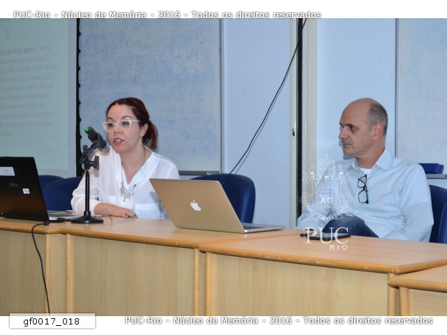 O professor Julio Diniz, do Departamento de Letras e a coordenadora setorial de pós-graduação do CTCH Monah Winograd, no II Colóquio de Pós-Graduação com o tema Humanidades em Tempos de Cólera.