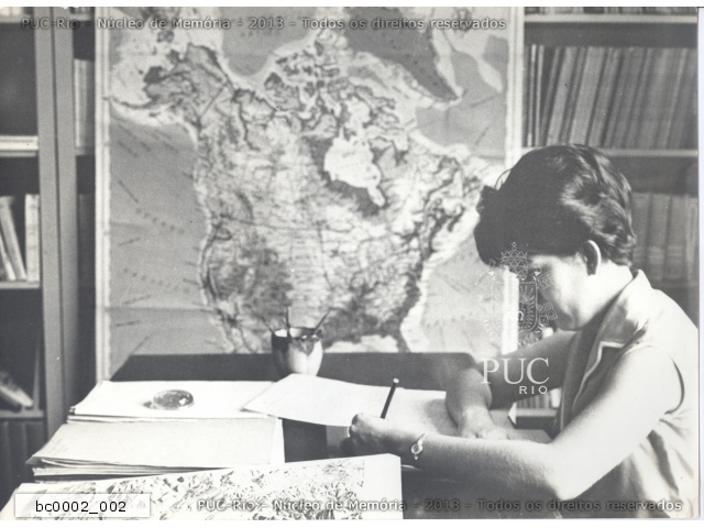 Aluna estuda na biblioteca da PUC-Rio, com um mapa da América do Norte ao fundo. |