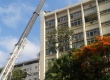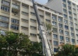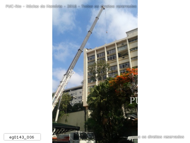 Guindaste posicionado para içar e entregar pelas janelas os novos equipamentos dos laboratórios do Departamento de Química. |