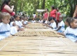 Jovens estudantes da rede pública aguardam início de atividade durante a feira. |