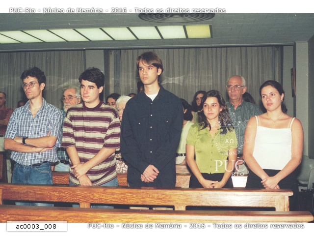Funcionários no campus após missa de Páscoa celebrada pelo pe. Pedro Belisário Velloso Rebello S.J. na Capela da PUC no pilotis Ed.Cardeal Leme especialmente dedicada aos funcionários da Divisão de Manutenção Técnica. |