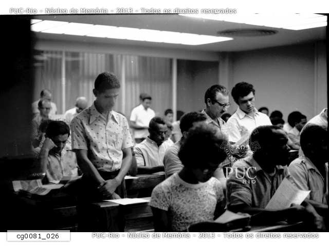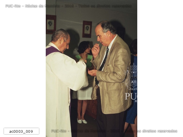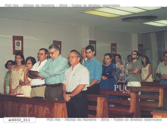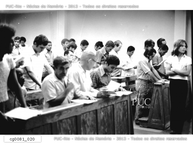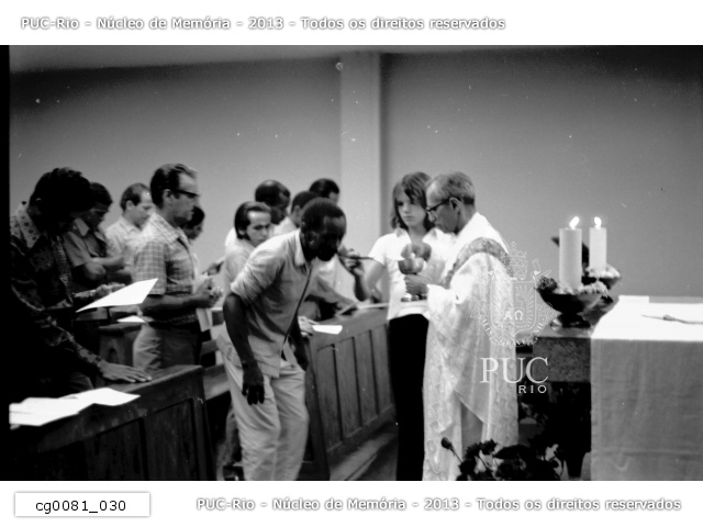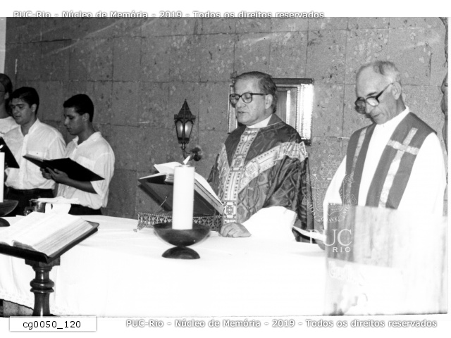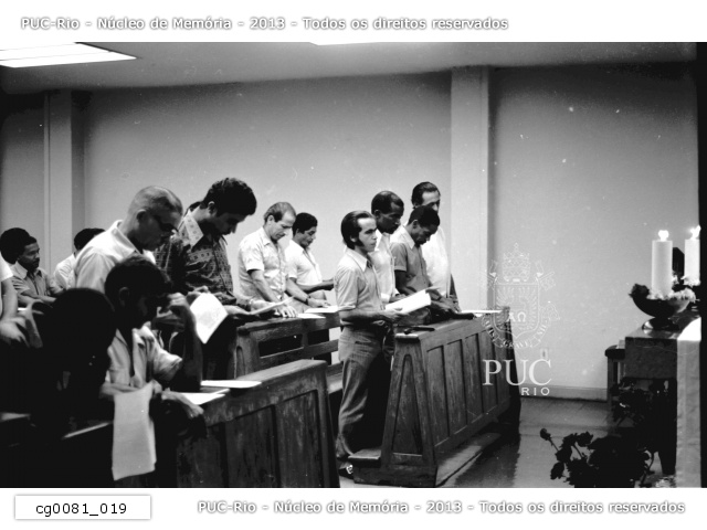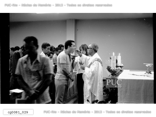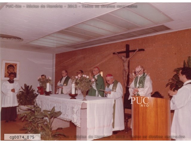 Missa da Páscoa celebrada pelo pe. Pedro Belisário Velloso Rebello S.J. na Capela da PUC, nos pilotis do Ed.Cardeal Leme, especialmente dedicada aos funcionários da Divisão de Manutenção Técnica. |