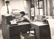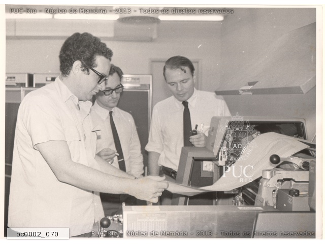 Pesquisadores operam o computador Burroughs 205, o primeiro computador da PUC-Rio, conhecido como cérebro eletrônico e com memória de cerca de 16Kb. |