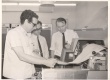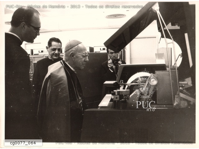 Visita ao CPD da PUC-RIo no mesmo dia da homenagem ao Jubileu do Cardeal Dom Jaime de Barros Câmara. Dom Jaime observa uma impressora. |