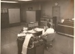 Pesquisadora faz anotações apoiada no console do Computador Burroughs 205. |