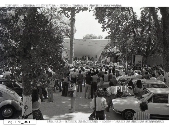 A Banda Sinfônica do Corpo de Bombeiros se apresenta na antiga Concha Acústica no Projeto PUC-Funarte. Alunos e funcionários assistem. |