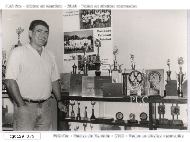 cg0129_376 | 18/5/1998 | O professor Antonio Duro, coordenador de Educação Física, posa ao lado dos troféus ganhos pelos alunos da PUC-Rio em entrevista sobre os futuros projetos esportivos. |