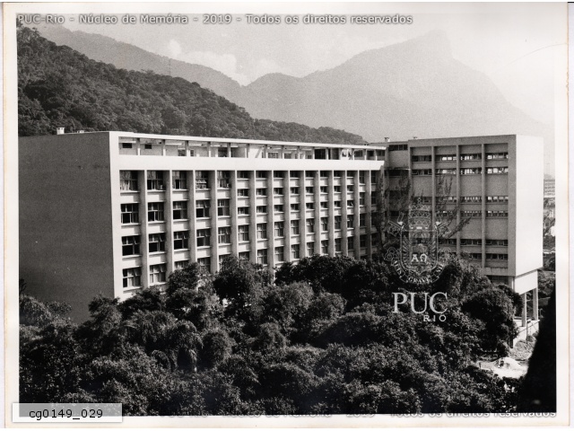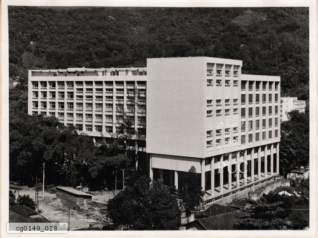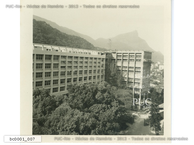 Edificio da Amizade, com a Ala Kennedy pronta e a Ala Frings ainda em obras, tendo ao fundo parte do Parque Proletário da Gávea e o morro do Corcovado. |