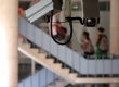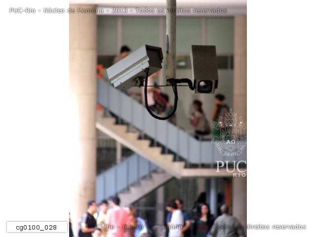 Fotografia exibindo câmeras de segurança e ao fundo, desfocadas, uma das escadas do pilotis do Edifício da Amizade |