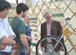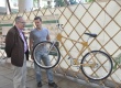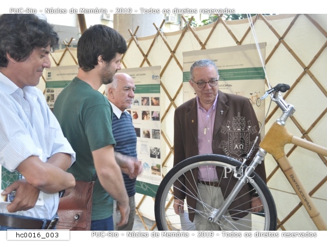 O Reitor pe. Josafá S.J. na abertura da exposição Mostra 2011, de estruturas de bambu, com a Bambucicleta, bicicleta feita à base de bambu. |
