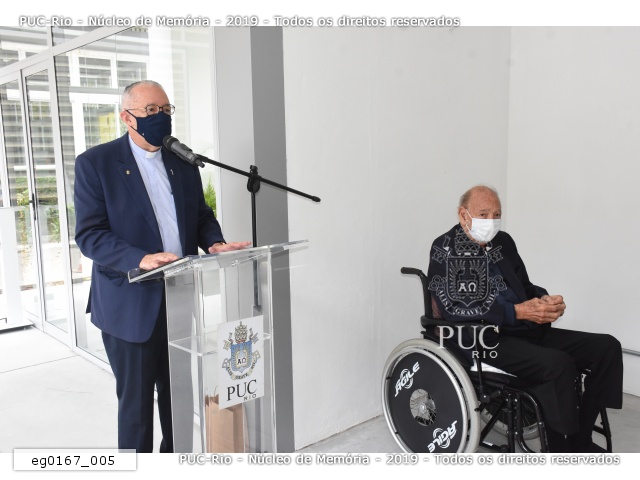 O reitor pe. Josafá S.J. discursa na cerimônia de inauguração do novo prédio do Departamento da Biologia. Ao seu lado, o ex-aluno Luiz Cyrillo Fernandes. |