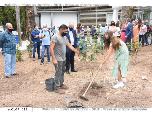 Gustavo Fernandes, filho do engenheiro Luiz Cyrillo Fernandes, planta muda de árvore na parte externa do prédio. |