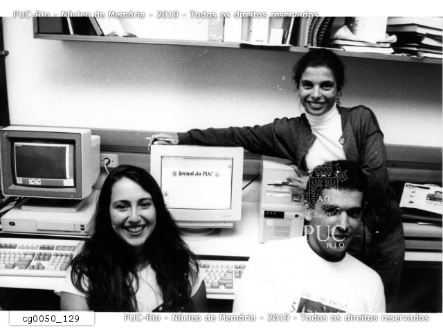 Parte da equipe responsável pelo lançamento da primeira versão eletrônica na internet do Jornal da PUC. |