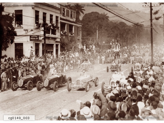 Largada da Corrida da Gávea, que ocorria anualmente e cuja largada nos primeiros anos era realizada na rua Marques de São Vicente em frente a atual entrada da PUC-Rio. Vê-se, à esquerda, a Padaria e Confeitaria Sport, no prédio hoje ocupado pelo Departamento de Serviço Social. É possível ver os trilhos dos bondes. Acervo do jornal O Globo. |