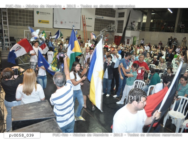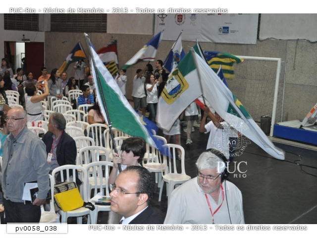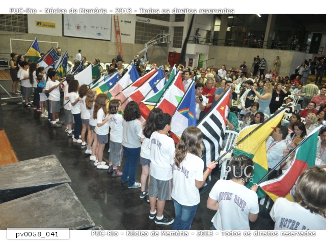 Conferência de abertura do 7° MUTICOM - Mutirão Brasileiro de Comunicação. Apresentação dos alunos do Colégio Notre-Dame, desfilando com as bandeiras dos estados brasileiros. |