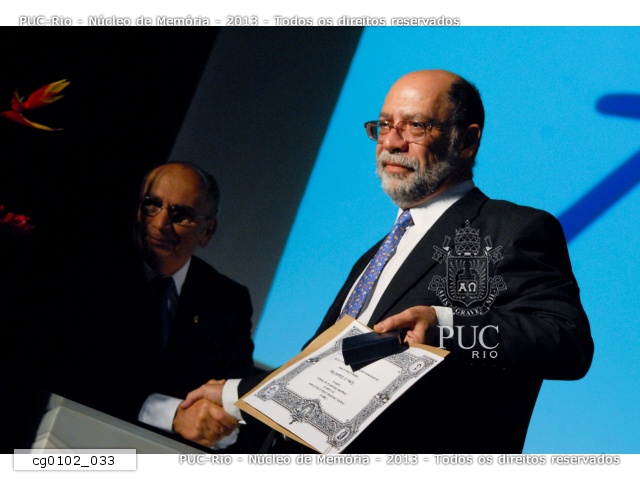 O professor Sérgio Besserman Vianna, do Departamento de Economia da PUC-Rio, representando o Prefeito Eduardo Paes, recebe o diploma e a medalha comemorativos aos 70 anos da PUC-Rio. |