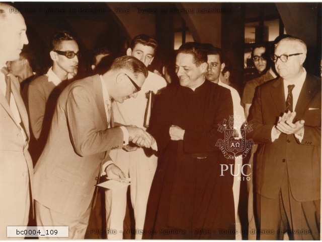 Aparentemente, o reitor Pe. Laércio S.J. recebe uma doação de uma empresa para um dos laboratórios do ITUC. |