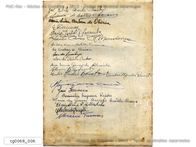 Lista com as assinaturas de quem estava presente na foto cg0068_05, do grupo em viagem pela América do Sul. |