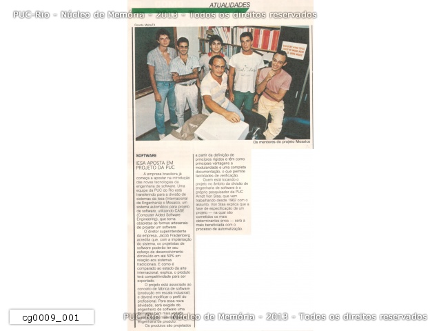 Matéria da Revista INFO sobre o sistema Mosaico, sistema automático para projeto de software: "IESA aposta em projeto da PUC". Foto da equipe do projeto. |