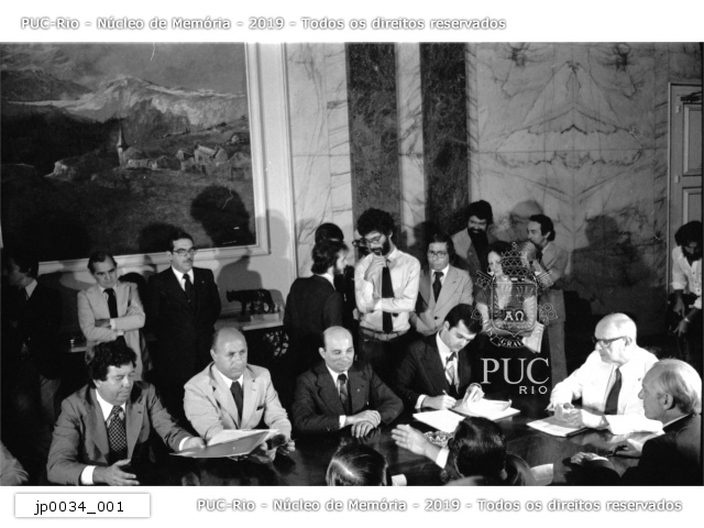 Cerimônia para assinatura do protocolo de Acerto Final com a presença de jornalistas e autoridades como o Reitor Pe. Mac Dowell S.J., o secretário-geral do Ministério da Fazenda do Estado do Rio de Janeiro, Márcio Fortes, entre outros. |