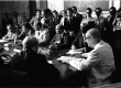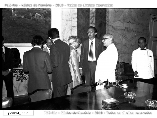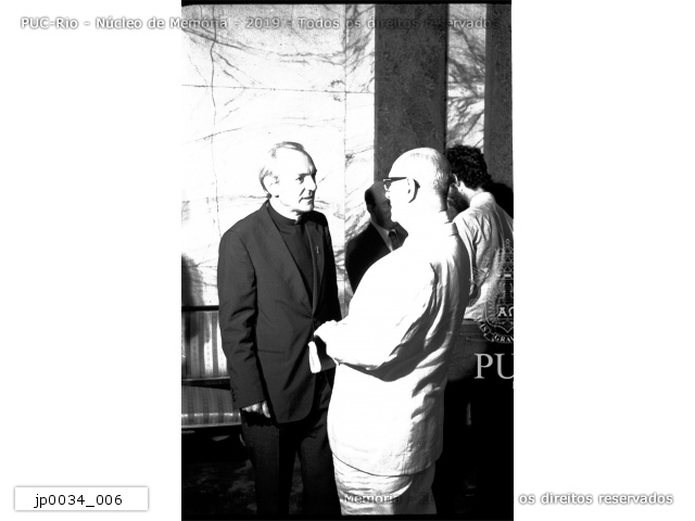Governador Chagas Freitas conversa com Dom Afonso Gregory, representante do Cardeal. Ao fundo o então Reitor, Pe. Mac Dowell. |