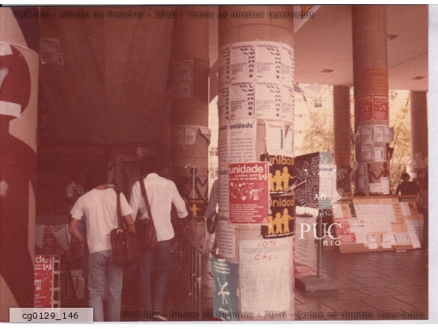 Cartazes e faixas do movimento estudantil em campanha para o DCE. Chapas Unidade e Travessia. |