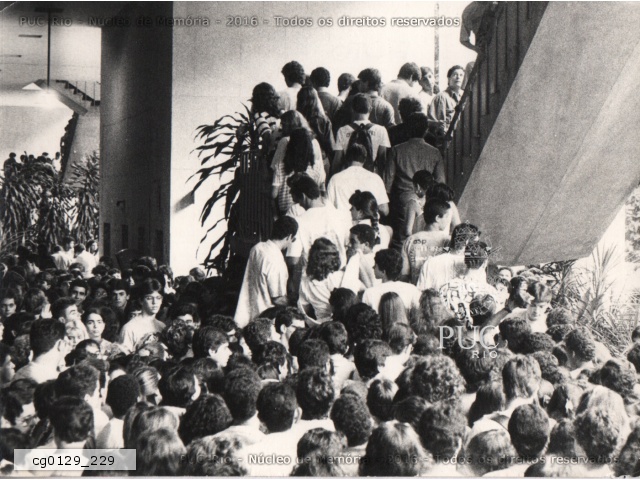 Alunos reunidos nos pilotis no aguardo da chegada de Miguel Arraes. Alunos observam das escadas. |