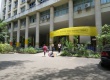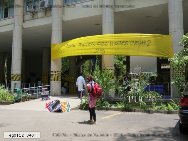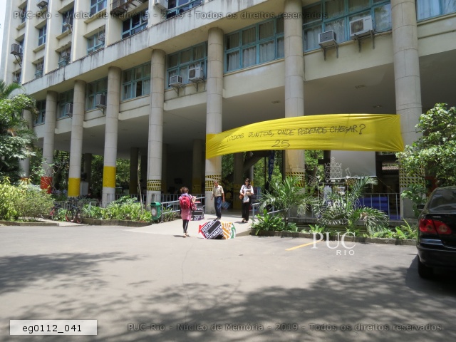 Intervenção com faixas amarelas nos pilotis do edifício da Amizade, com propaganda de chapas que disputaram as eleições de 2011 para o Diretório Central dos Estudantes da PUC-Rio (DCE). Propaganda do Festival da Primavera. |
