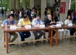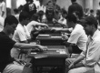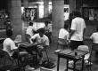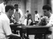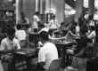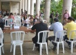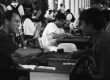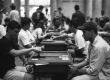 Alunos em mesas de gamão. |