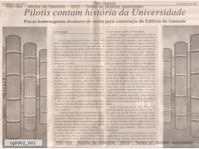 Matéria do Jornal da PUC, 11/10/2007. Lembrança dos beneméritos nas placas dos pilotis - p.1 |