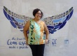 Funcionária Marta Bela Reis, da Biblioteca Central, em frente ao painel Asas colocado nos pilotis do Edifício da Amizade. |