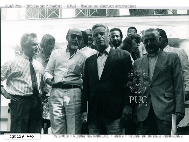 O professor e escritor brasileiro João Cândido Portinari, o fundador e diretor-geral do Projeto Portinari, filho do Candido Portinari, a professora Margarida de Souza Neves, coordenadora do Núcleo de Memória da PUC-Rio e o reitor da PUC, padre Josafá Carlos de Siqueira S.J na abertura da exposição Uma carta aos brasileiros, no Solar Grandjean. |