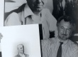 O professor João Candido segura a gravura O Retrato do Sr. Baptista, em homenagem a seu avô Giovan Battista Portinari. Ao fundo, uma fotografia do seu pai, o pintor Candido Portinari, com seus pinceis de trabalho. |